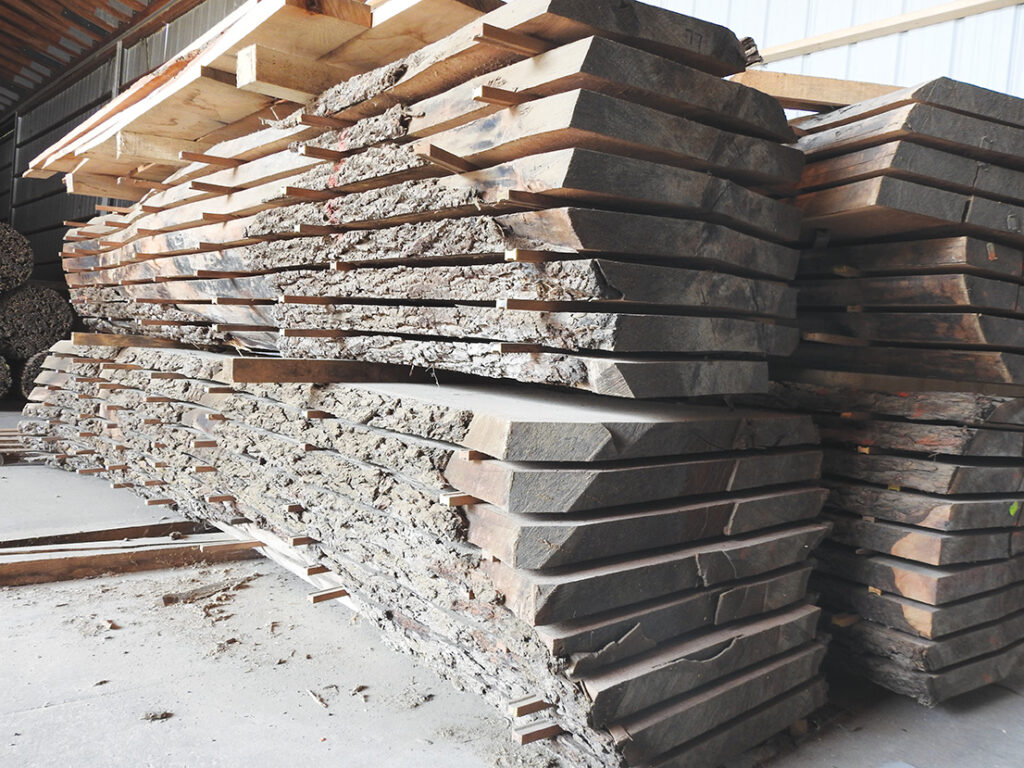 In this picture, live edge Walnut boules cut to 10/4 are staged for sale.